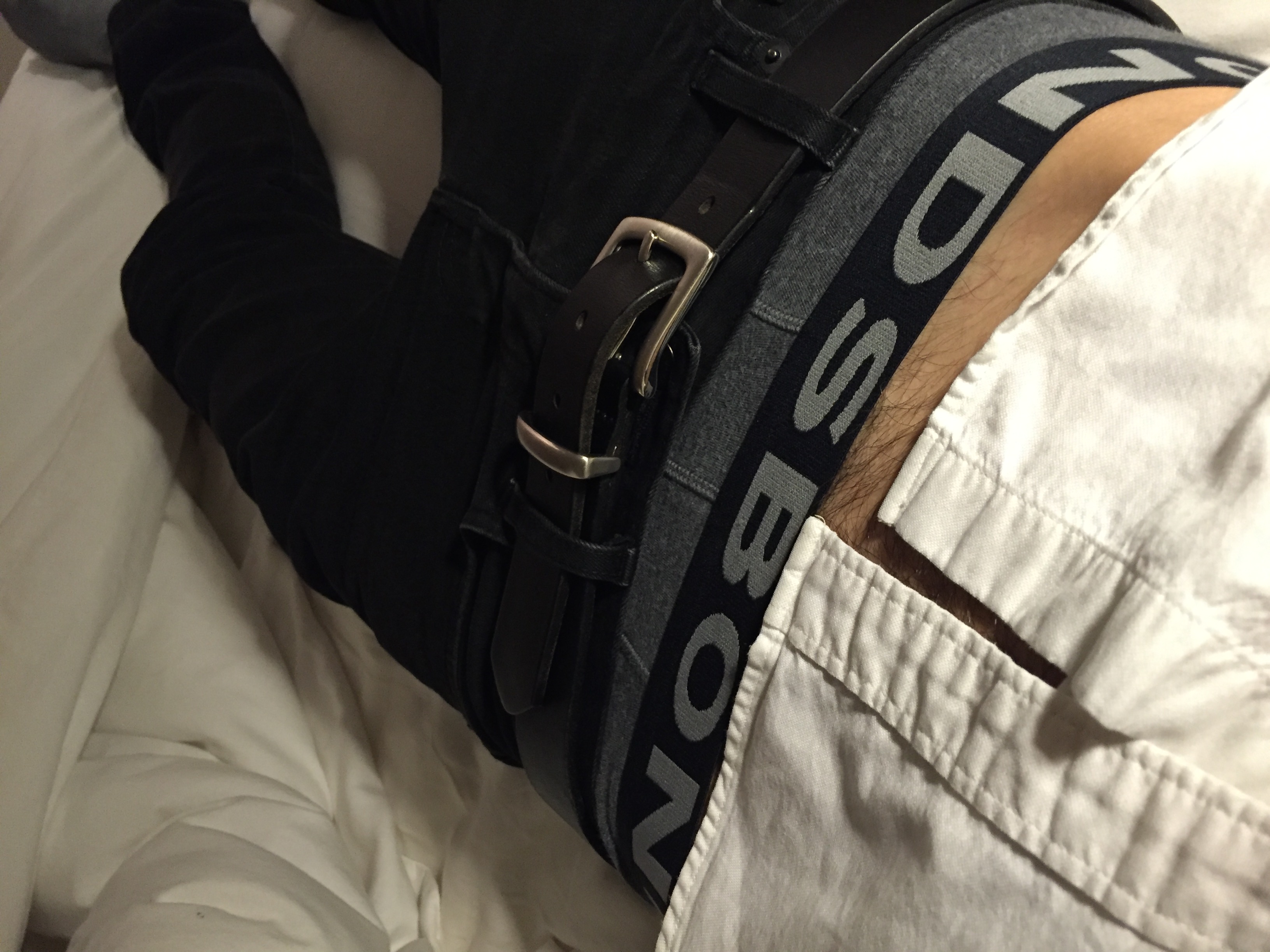 brown khaki shorts, brown belt, purple american apparel briefs. shirtless because it is too damn hot in my apartment