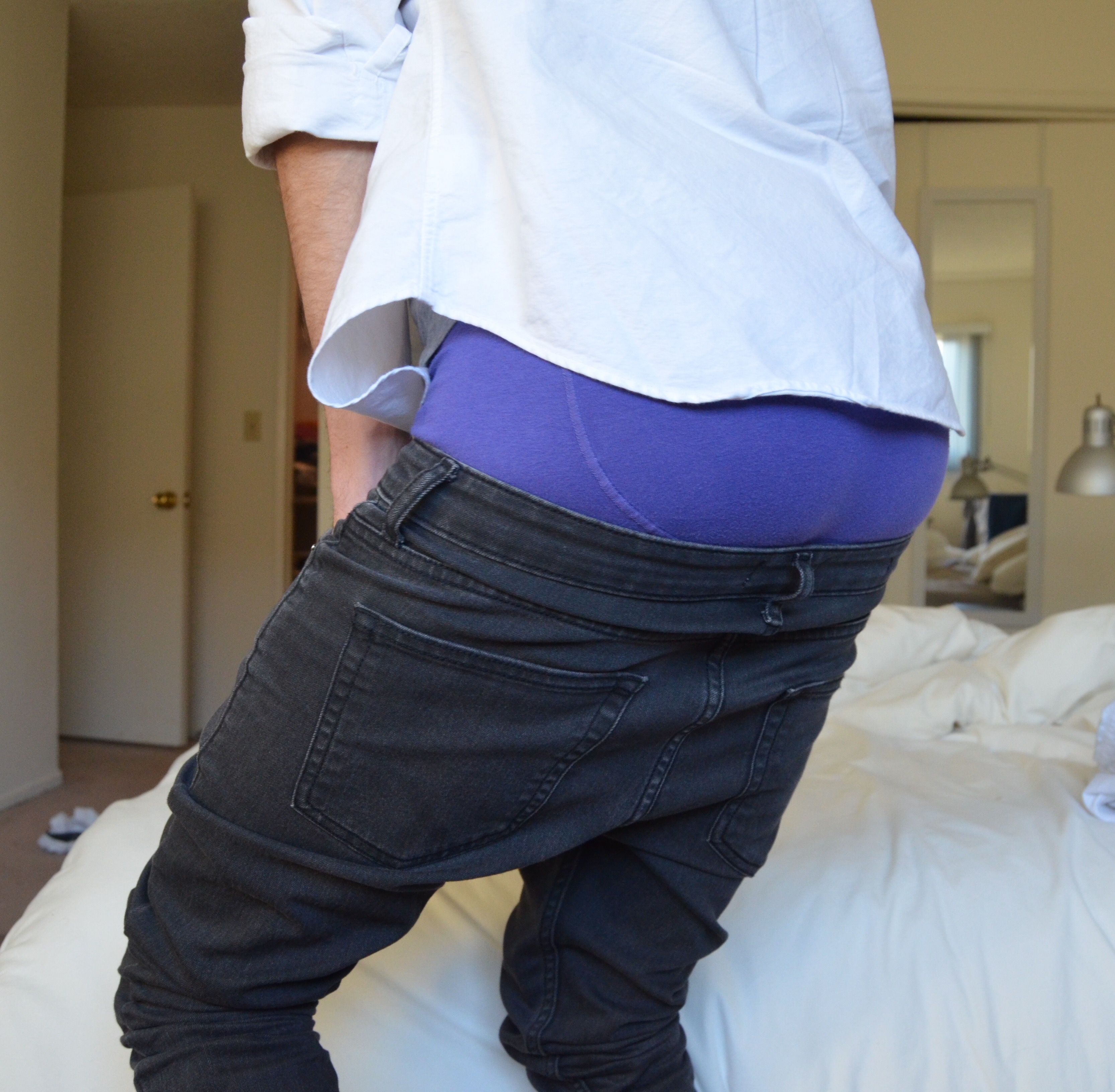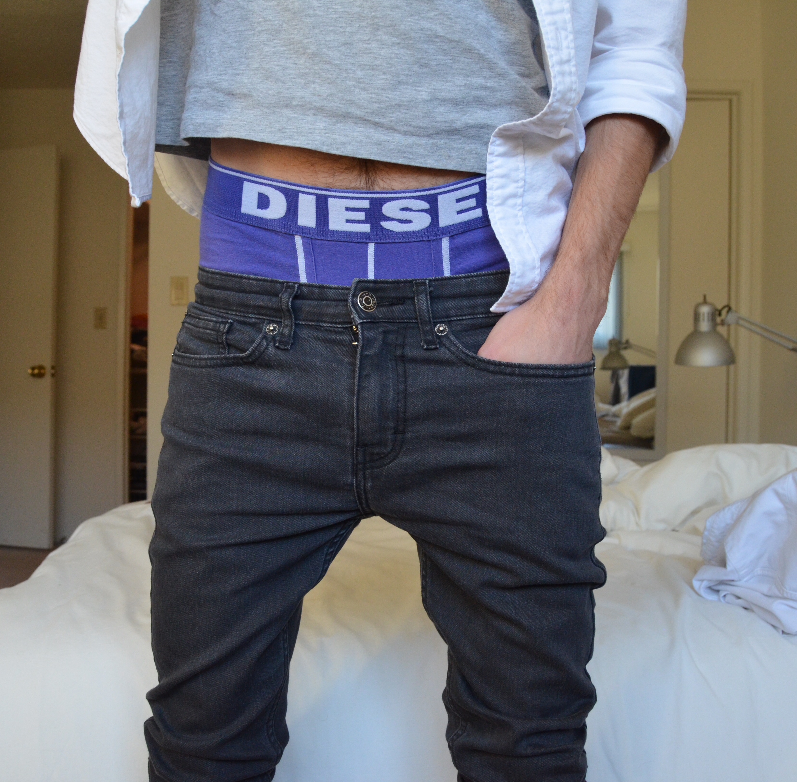 Grey Uniqlo t-shirt, white Uniqlo button down, dark grey Topman skinnies, purple Diesel boxerbriefs